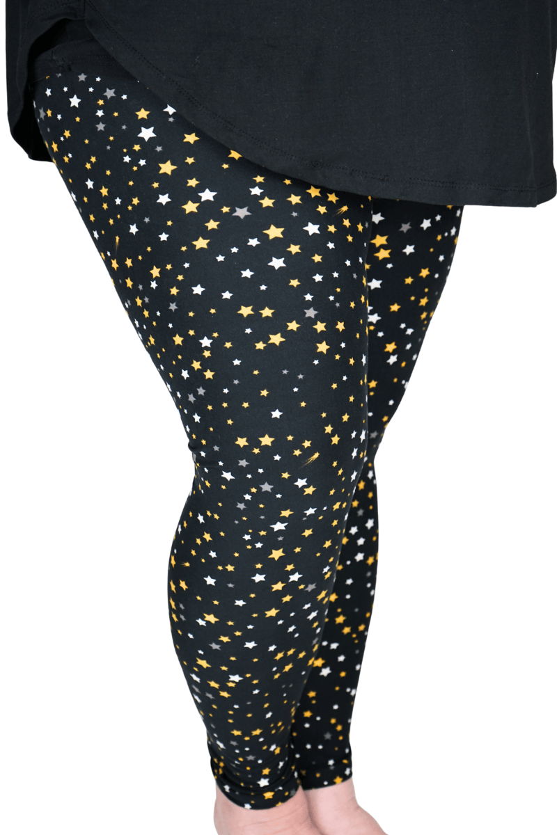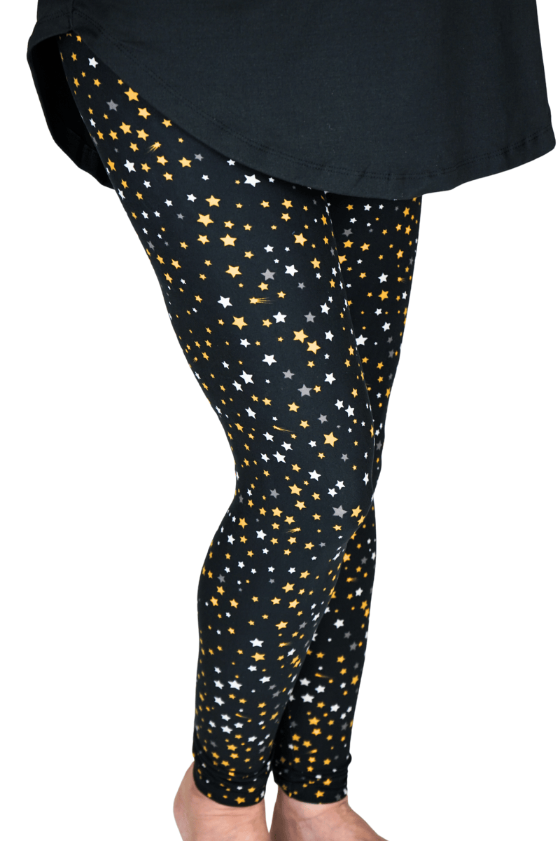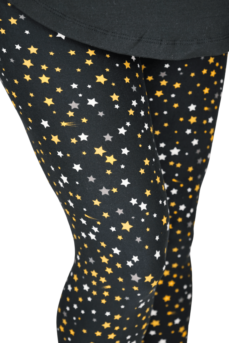 Shine bright with our A STAR IS BORN Leggings, featuring a dazzling constellation of stars - some even shooting - in tones of Harvest Gold, Grey, and Marigold against a sleek black background.