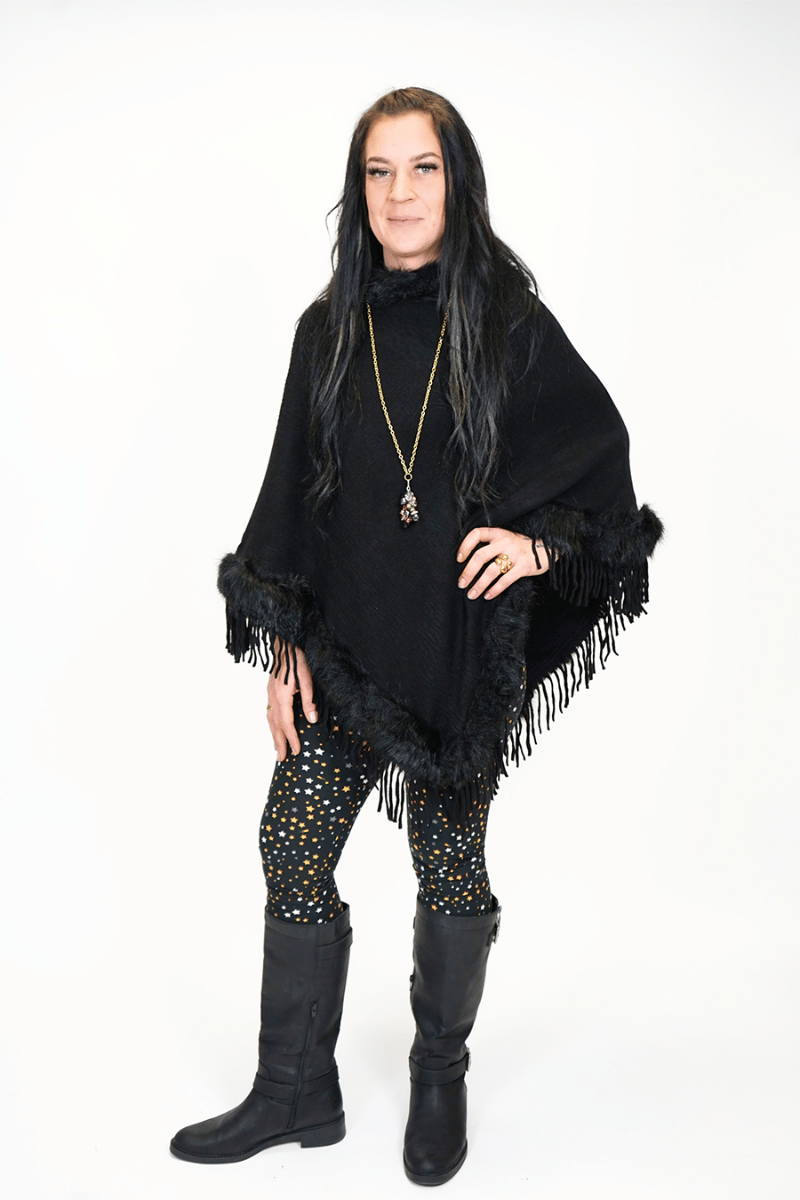 Nuestro poncho FOXY LADY tiene un impresionante cuello de piel sintética y un fondo con flecos. Esta pieza realzará cualquier conjunto. Combínalos con leggings y top negros sólidos para una apariencia elegante, o coordina con Hey Glen. leggings y una blusa Boyfriend blanca. De cualquier manera... ¡te ves muy bien!