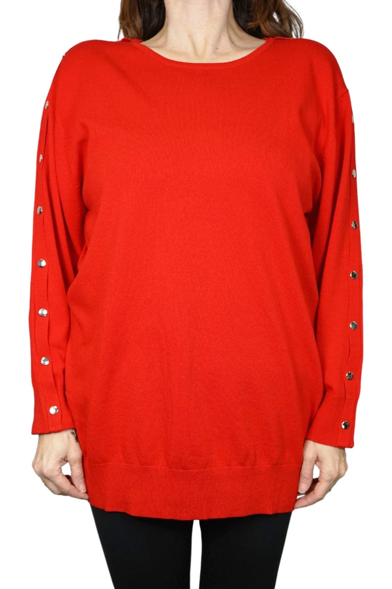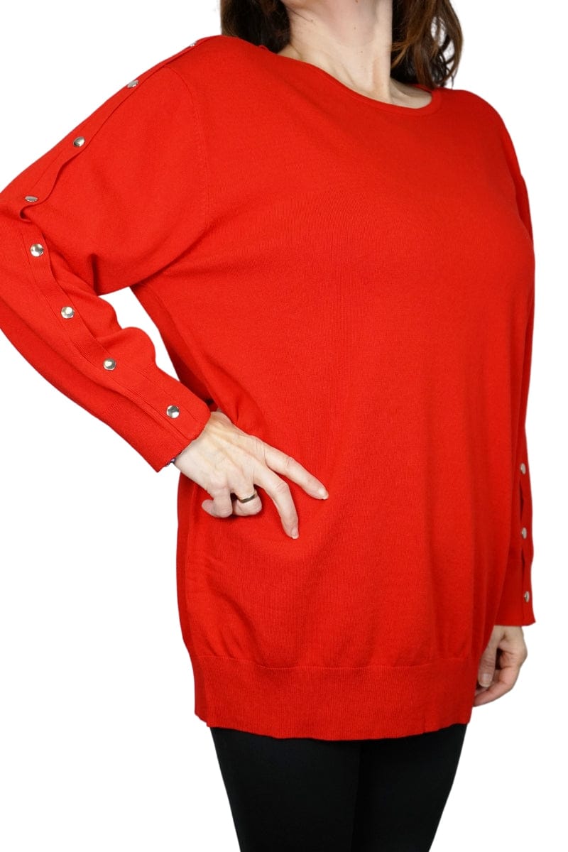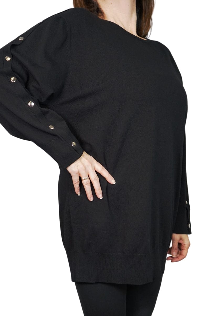 Look cute as a button in our JAZZY BUTTON SWEATER! This knitted slimline design reinvents your traditional dolman sweater for everyday elegance and its longer length makes it perfect to wear with leggings. The sleeves are lined with silver buttons from wrist to shoulder adding a bit of shine and flash, and the ribbed cuffs and banding add great structure. The extra length in this sweater creates a flattering profile for your hips and the perfect accompaniment to leggings. Instantly dress up any pair of leggings, like Shifting Sands, New Blooms, Black Onyx, and more. It's the simple details that count! Also available in Red. This elegant sweater is made of 100% viscose with a luxurious look and feel to it.