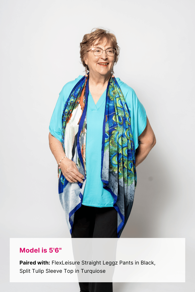 Our PEACOCK BLUE SCARF has a luxurious silky feel to it with an elegant print to it in tones of blues and greens, with pops of greys, black, oranges and yellows.
