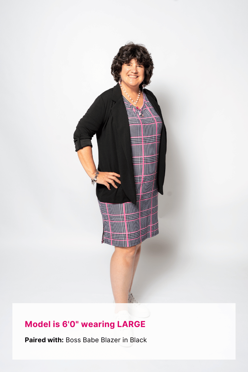 Our CUFFED TEE Dress is built with the same looser straight silhouette body shape as our Cuffed Tee tops. This dress features a v-neck neckline, hidden side pockets, a straight hem with side slits for ease of wear, and a mid-arm length sleeve with cuffs. The Cuffed Tee creates a dressier look with the same great comfort as it’s made with the same material as our well-loved leggings.