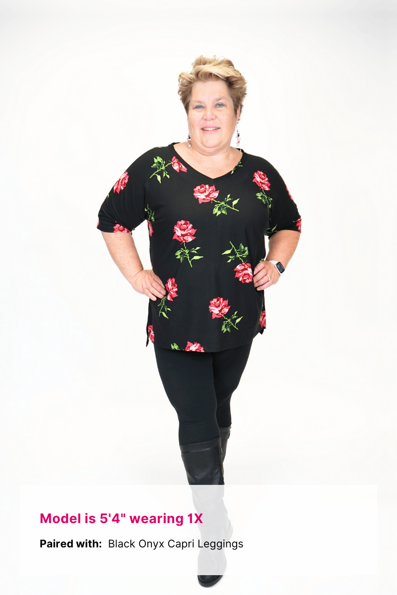 OurĀ Cuffed TeeĀ has a looser straight silhouette with a split high/low hem. With a flattering v-neck, and a mid-arm length sleeve with cuffs, the Cuffed Tee creates a dressier look with the same great comfort as itās made with the same material as our well-loved leggings.