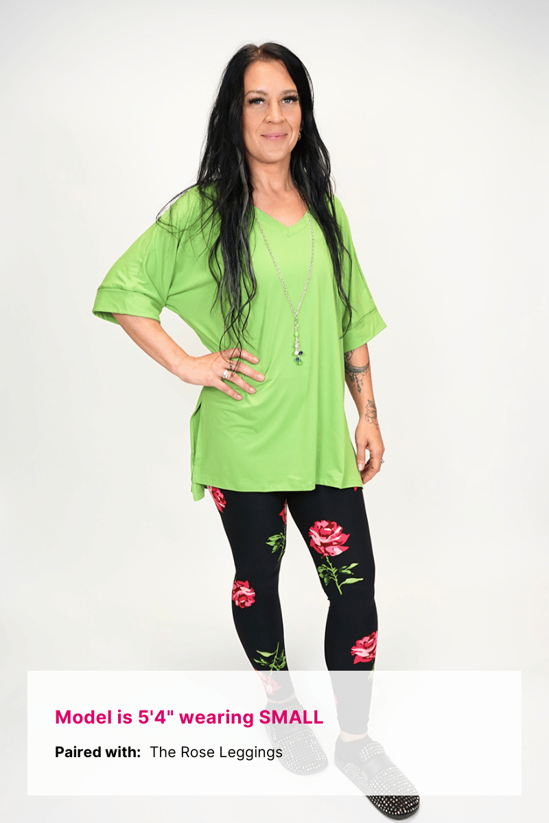 OurĀ Cuffed TeeĀ has a looser straight silhouette with a split high/low hem. With a flattering v-neck, and a mid-arm length sleeve with cuffs, the Cuffed Tee creates a dressier look with the same great comfort as itās made with the same material as our well-loved leggings.