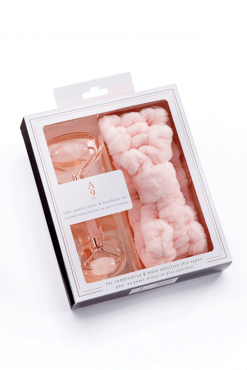 Get ready for an am/pm skin care routine with this 2 pc set that includes a Soft Headband and a dual sided Rose quartz Roller (2.25 x 5.5). Unlock the rose quartz's loving and healing power. Suitable for combination and more sensitive skin types. Enjoy a cool, soothing and uplifting facial massage while you improve your skin elasticity, circulation and reduce puffiness. Featured in a sleek and soft hued gift box (6.75 x 1.5 x 8). Rose Quartz, Zinc alloy, flannel.