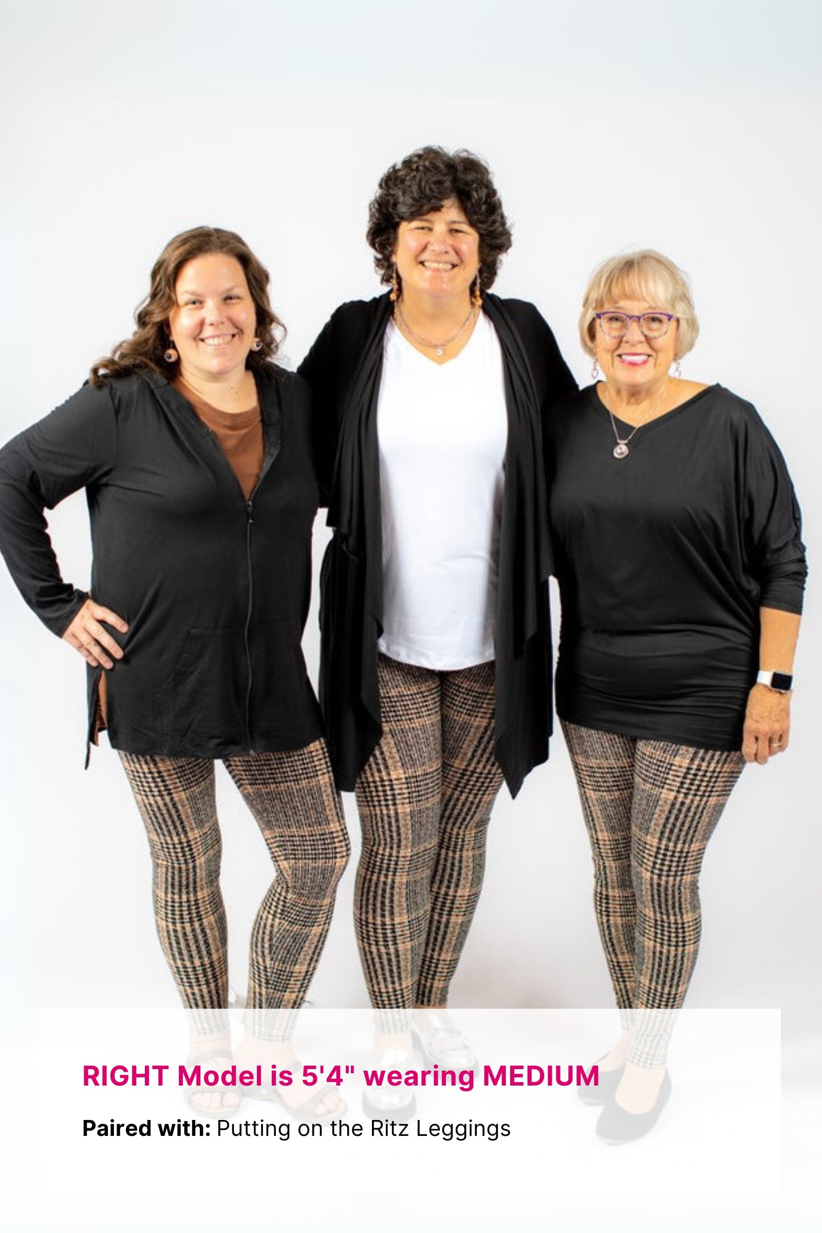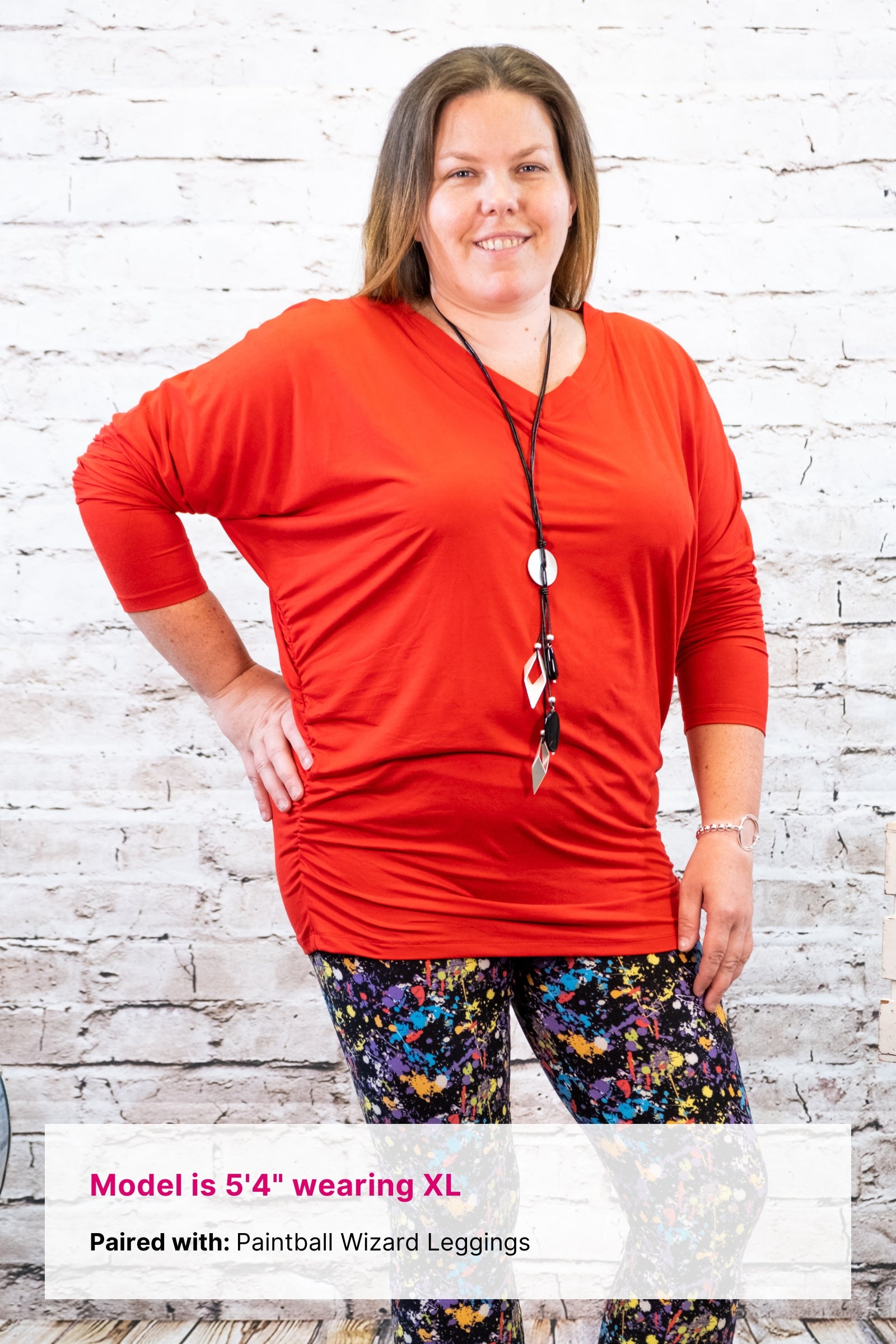 Our V-Neck DOLMAN TOP is made in the same soft material as our leggings and adds a different look to your ensemble than our tees. With batwing arms and a ruched waist, it can dress up your look.